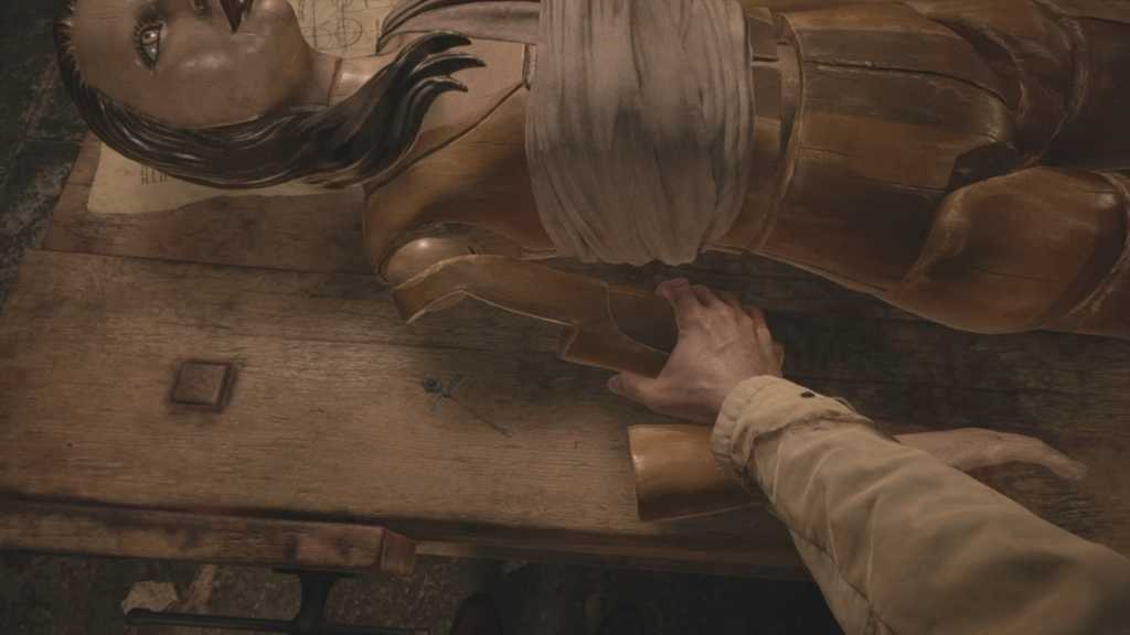 Войдите в дом Беневиенто и найдите лифт. Спуститесь в подвал. Пройдите по коридору в единственную незапертую комнату и подберите колбу. Итан потеряет все оружие, а перед вами на столе появится женское тело из дерева. Изучите его и найдите кольцо, покрытое кровью, а также серебряный ключ в плечевой части правой руки. Осмотрите левую ногу и заберите заводной ключ.