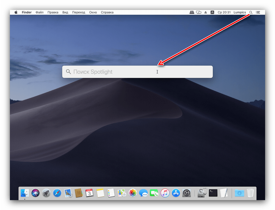 - Проще всего открыть приложение через инструмент Spotlight: кликните по кнопке в виде увеличительного стекла, затем напишите в поиске слово терминал.