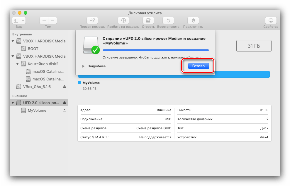 Дождитесь, пока процедура форматирования будет окончена. В окошке оповещения нажмите «Готово».