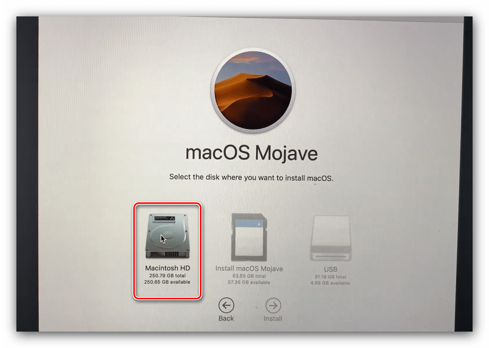 Выберите отформатированный ранее диск (в большинстве случаев это должен быть «macintosh HD»).