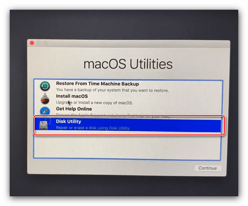 Отформатируйте виртуальный диск. Для этого выберите Дисковая утилита и нажмите Продолжить: