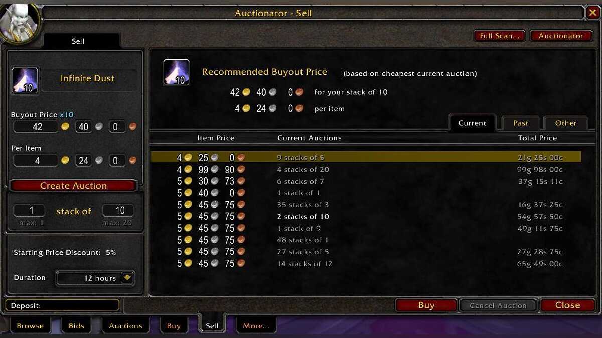 Очень полезным будет расширение Auctionator, которое позволяет вам видеть цены на складываемые в аукционном доме предметы и записывать историю цен.