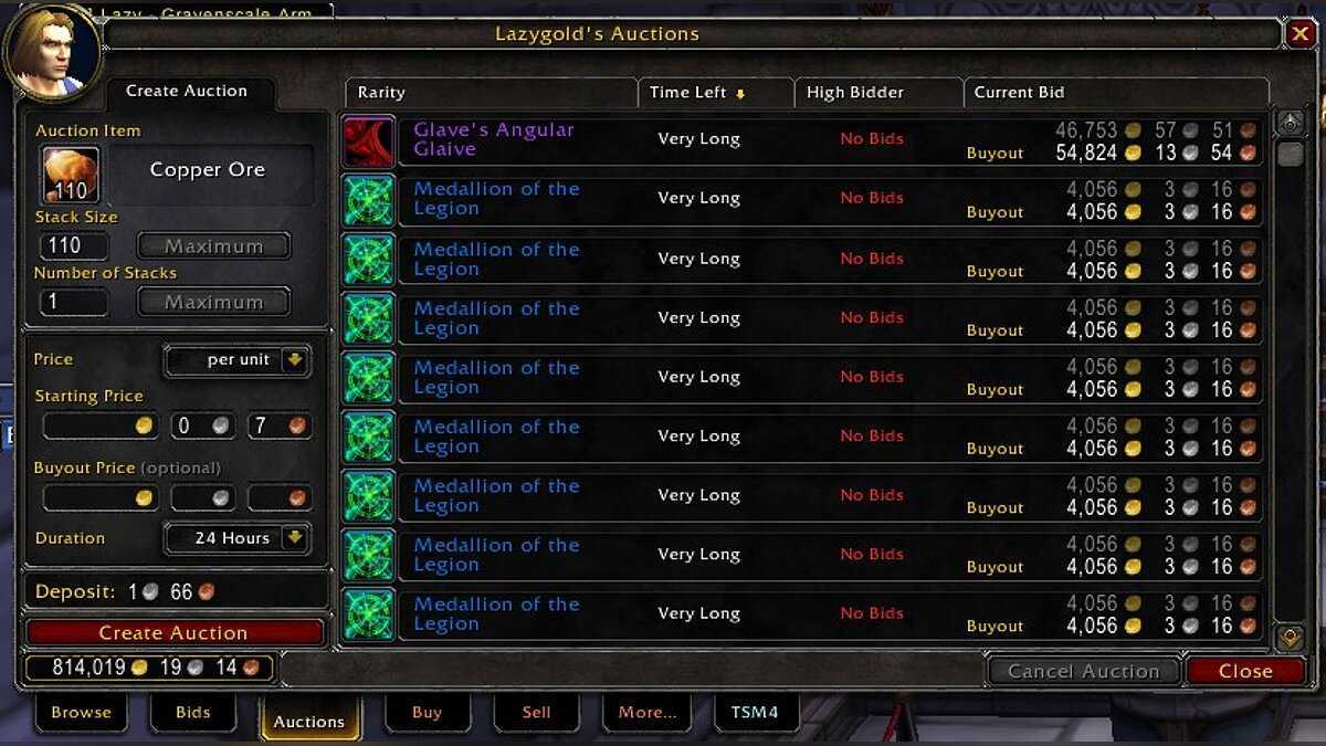 Наконец, аукцион берет свою комиссию с продажи каждого товара. Ту цену, которую вы указываете для выкупа, заплатит покупатель, однако вы получите меньшую сумму. Опять же есть свои нюансы в комиссии аукционных домов от фракций или на нейтральных территориях. Фракционные дома берут 5% от стоимости, нейтральные — 30%.