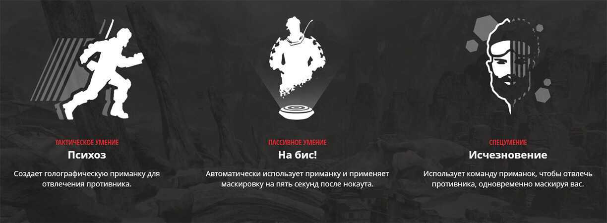Пассивка активируется, когда Миража подобьют. Сам персонаж становится почти невидимым на 5 секунд, а на его месте появляется голограмма. Маскировка отвлекает соперников и дает возможность герою отползти на безопасное расстояние, чтобы где-то спрятаться.