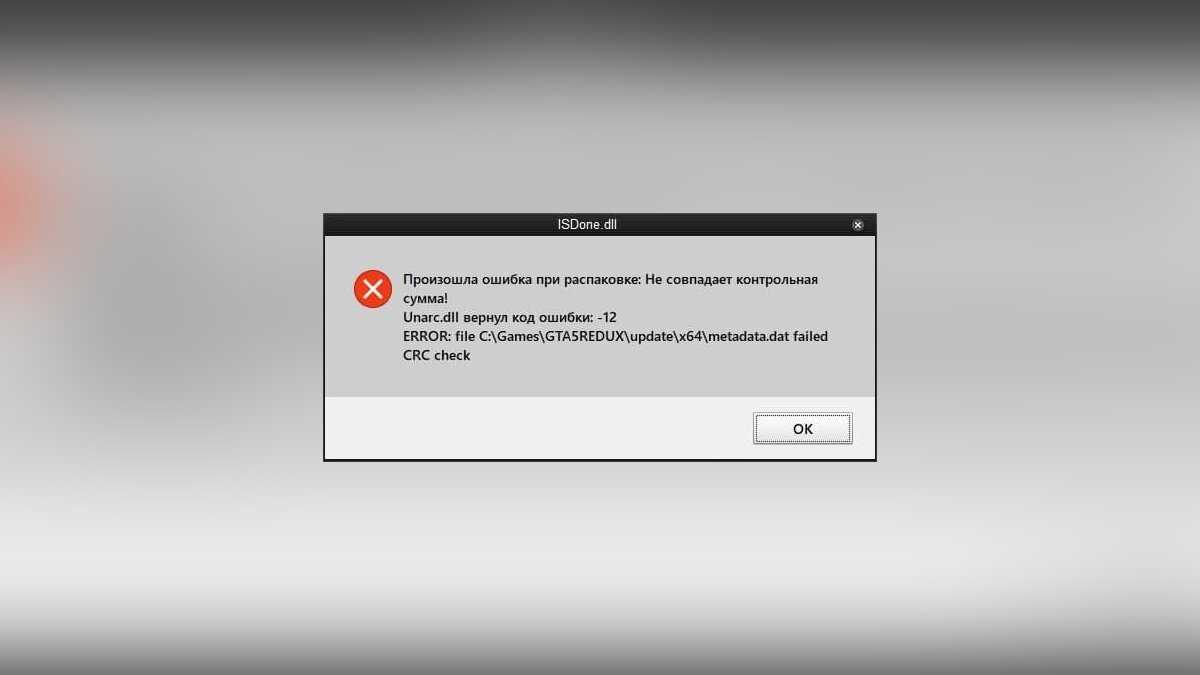 Скриншот ошибки «Произошла ошибка при распаковке не совпадает контрольная сумма 12»