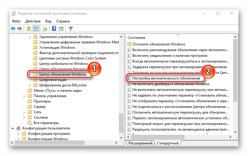 - «Конфигурация компьютера -> Административные шаблоны -> Компоненты Windows -> Центр обновления Windows«