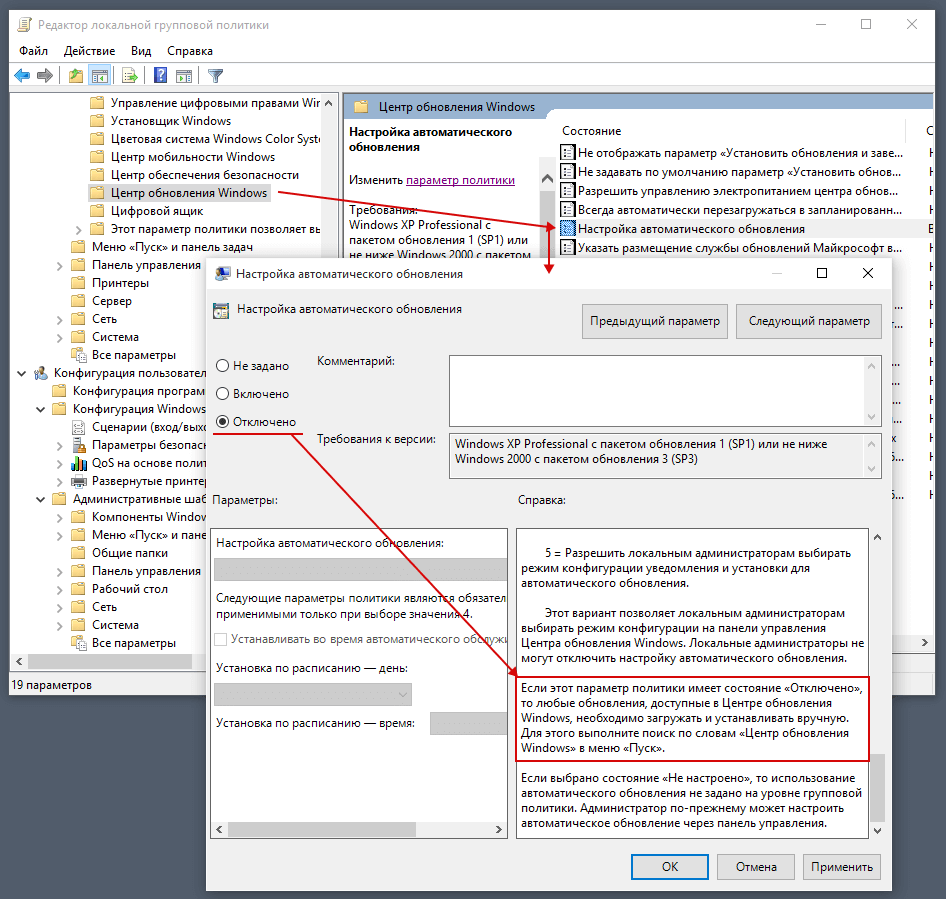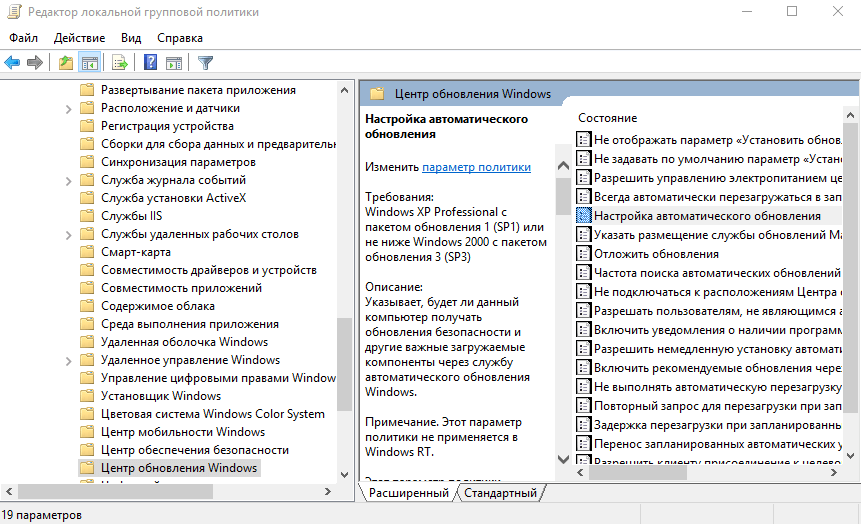 Позволяет полностью отключить обновления или настроить их как угодно. Подойдет только для сборки Windows 10 Pro, потому что в Windows 10 Home стоит ограничение, и изменять групповую политику там нельзя. Для «Home» смотрите вариант с изменением реестра.