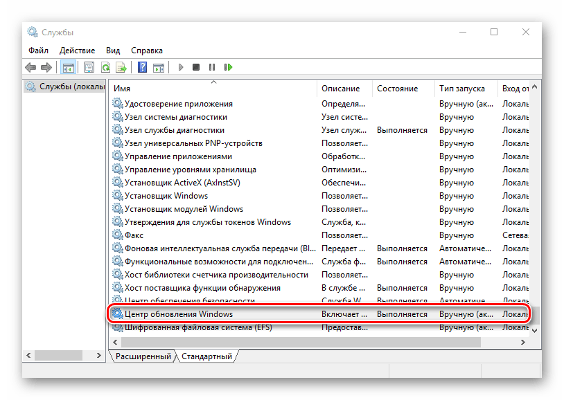 - Прокрутите список, который находится в этом окне, вниз и проверьте состояние службы Wuauserv. Если она выполняется, значит, установка апдейтов включена и работает. Если нет, то Центр обновлений выключен.