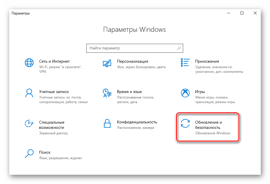 Через открывшееся окно «Параметры Windows» необходимо попасть в раздел «Обновление и безопасность». Достаточно кликнуть по его названию один раз левой кнопкой мышки.