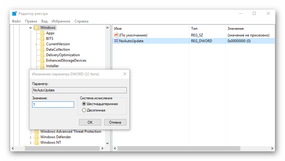 Назовите новый параметр «NoAutoUpdate». Затем дважды кликните по нему и в поле «Значение» открывшегося окошка впишите единицу. Сохраните настройку нажатием ОК.