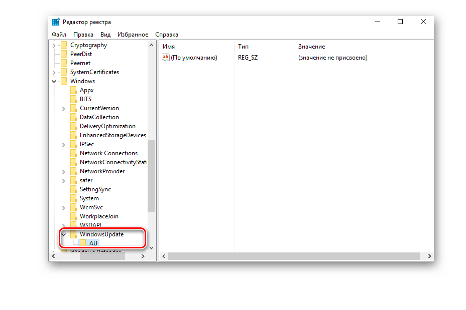 - Откройте в редакторе реестра раздел HKEY_LOCAL_MACHINE\SOFTWARE\Policies\Microsoft\Windows\WindowsUpdate\AU