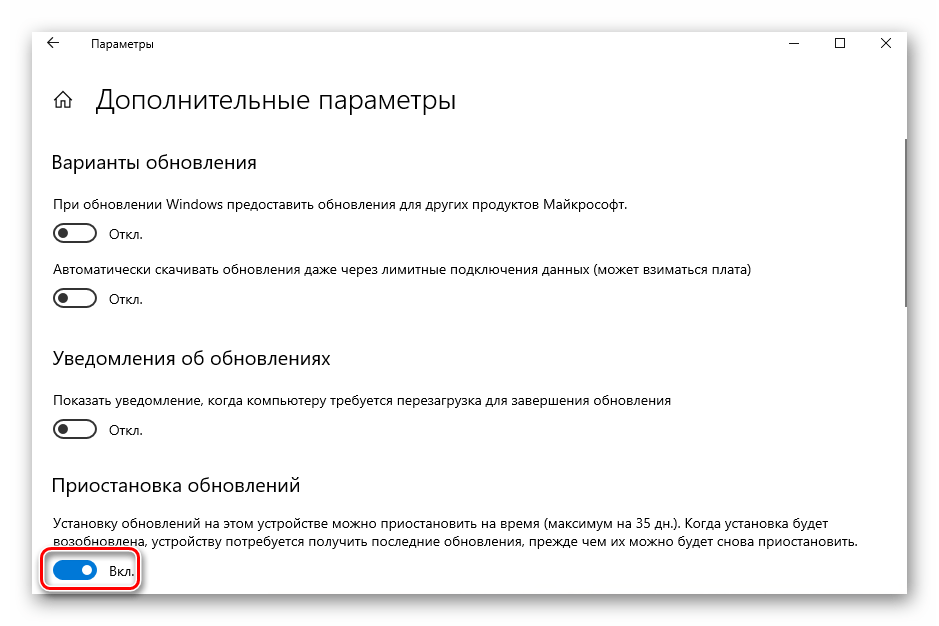 После этого отыщите на появившейся странице раздел «Приостановка обновлений». Передвиньте переключатель, который находится ниже, в положение «Вкл.»