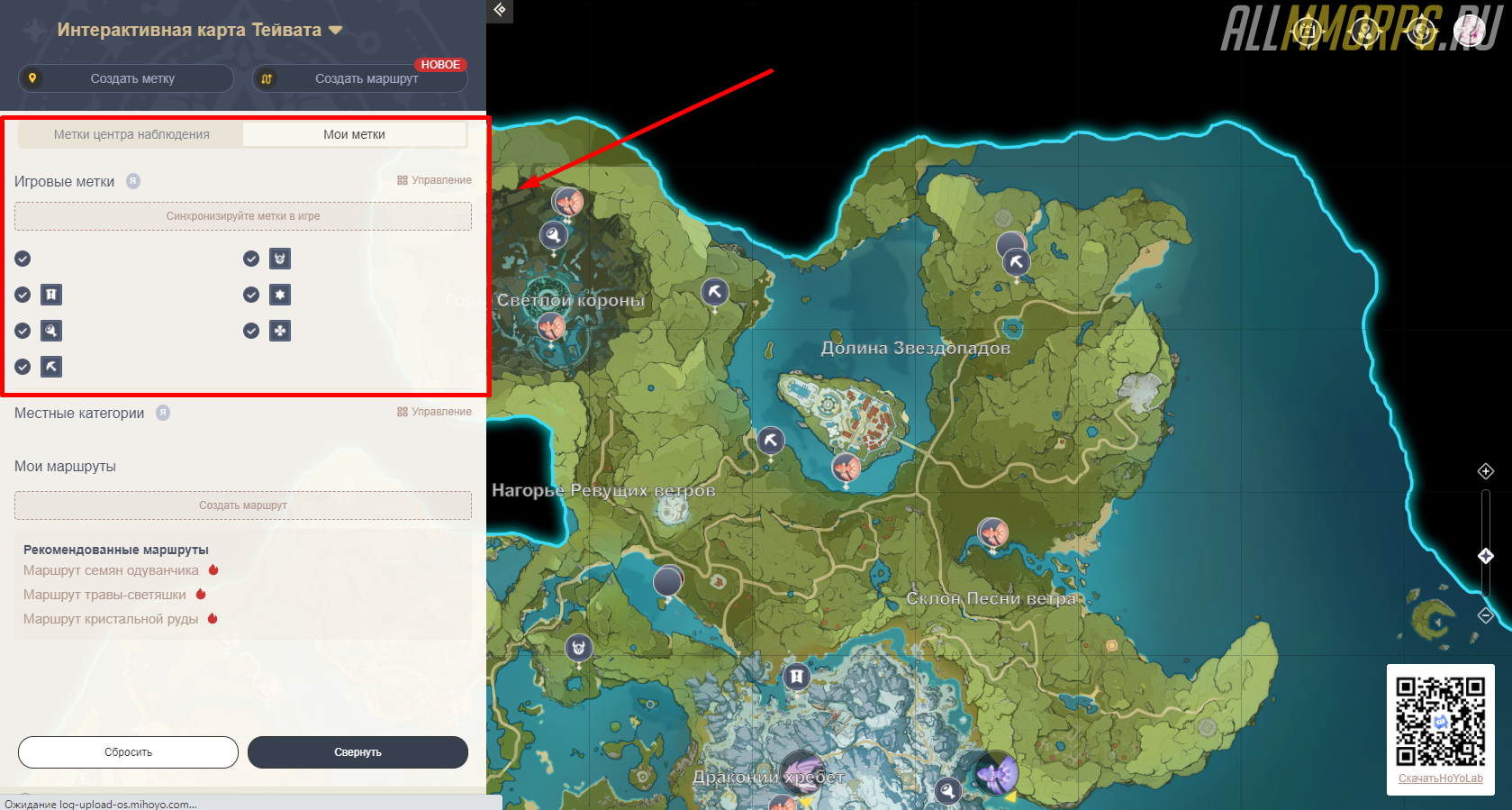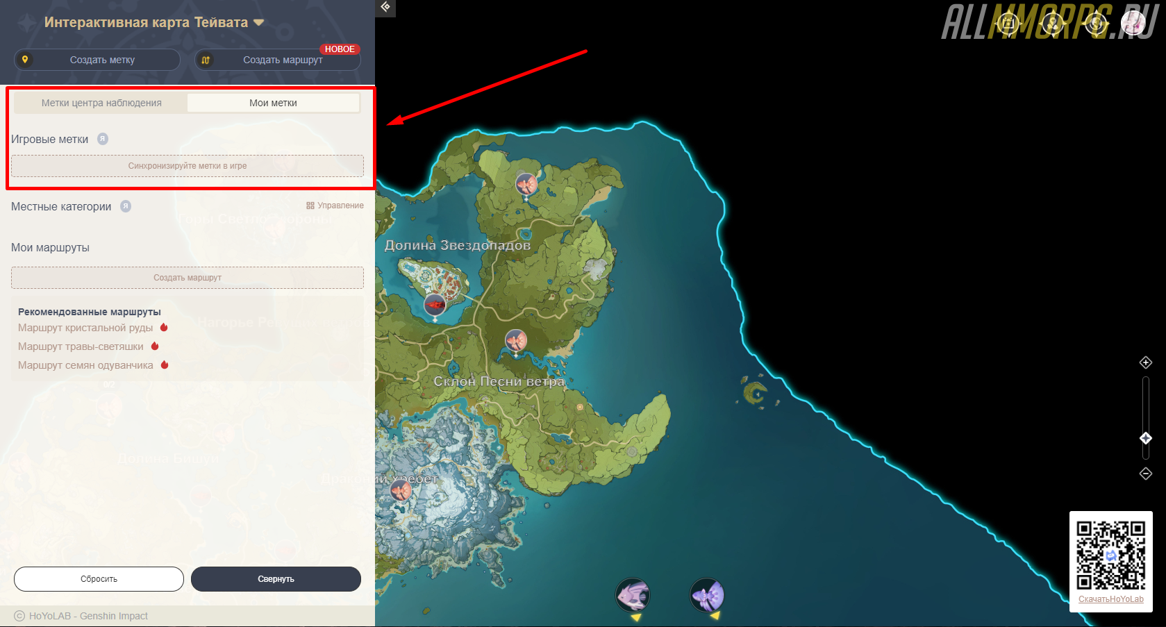 Чтобы отобразить метки на карте, которые вы оставляли в игре, перейдите в раздел «Мои метки» и нажмите на «Синхронизируйте мои метки в игре».
