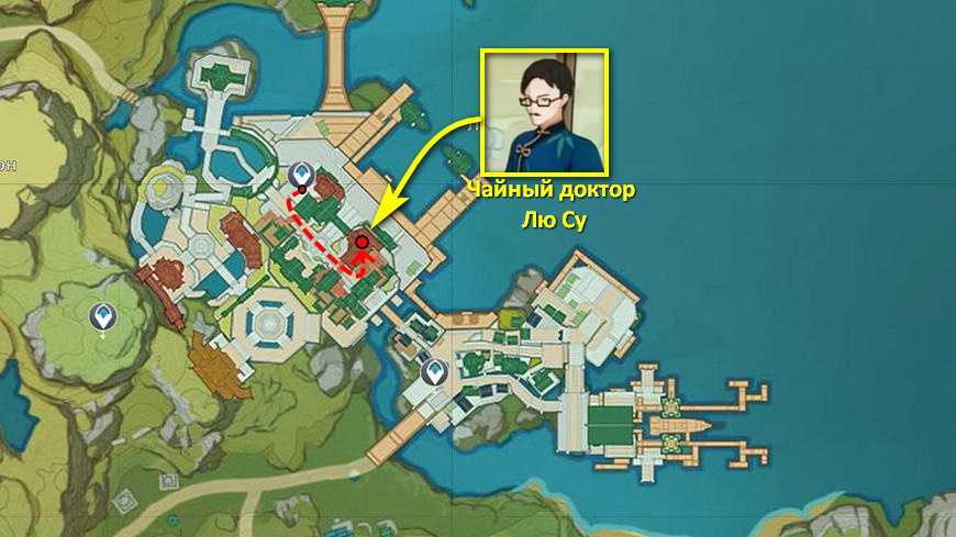 Начинаем отслеживать квест и используем телепортацию на ближайшую к пункту назначения точку. Ищем Чайного доктора Лю Су, упростить процесс поиска может двойное нажатие на клавишу V (для ПК), тогда золотая дорожка сама приведет к рассказчику.
