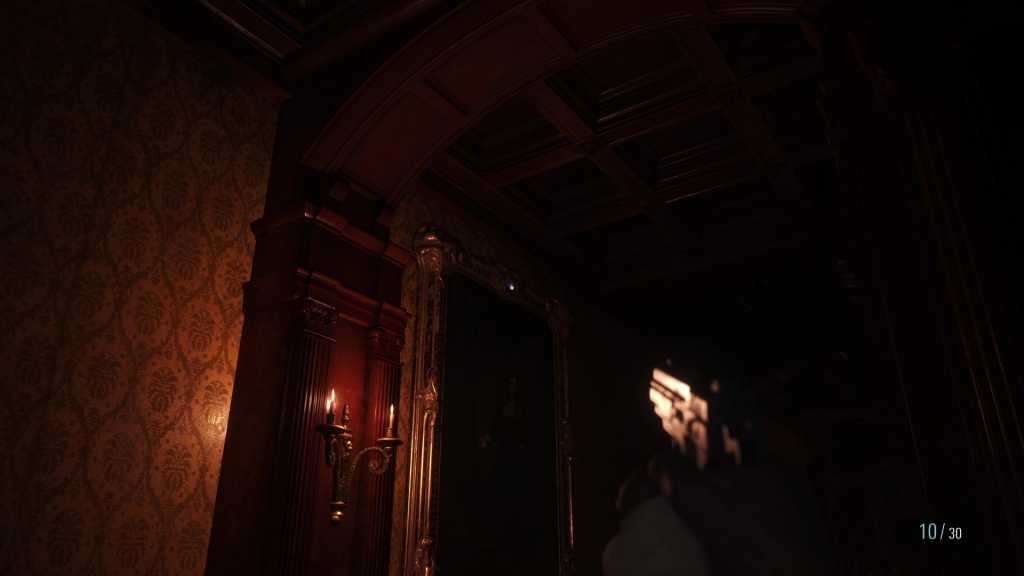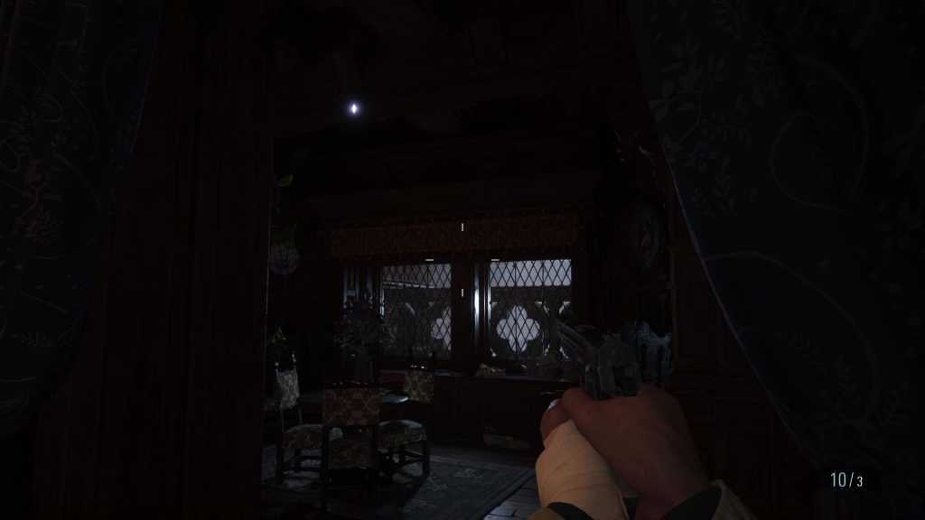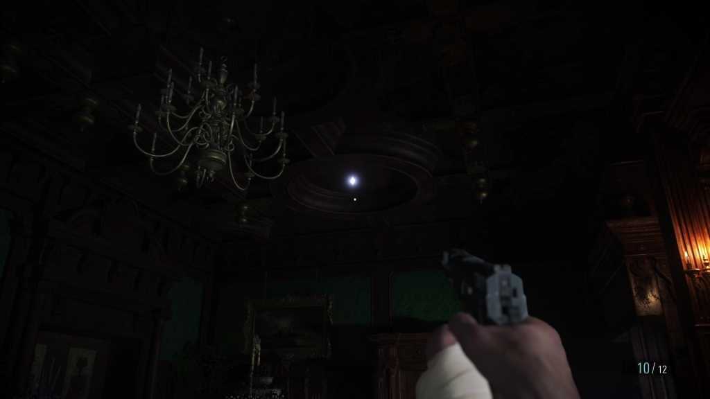 В комнате, где Димитреску разглядывала бутылку «кровь девственницы», перед спуском в подземелье. В темном коридоре на потолке.