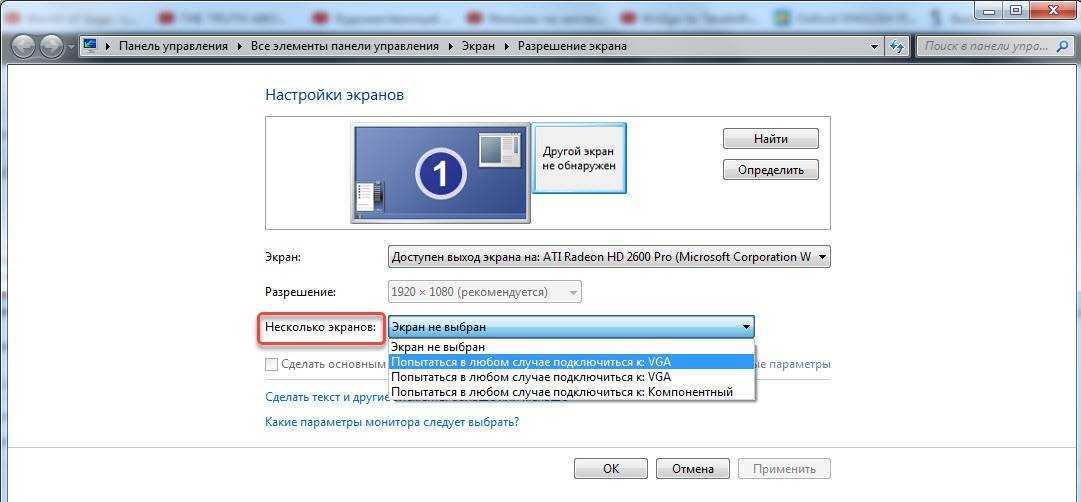 Открываем список «Несколько экранов». Задействуем параметр «Попытаться в любом случае подключиться к VGA».