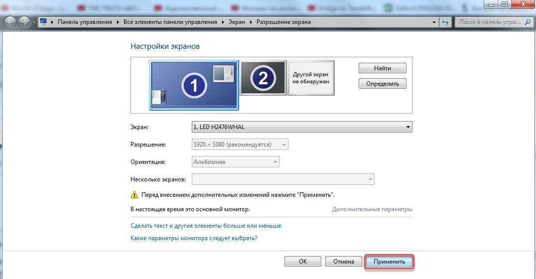 Система проводит поиск и сообщает, что другие мониторы не обнаружены. Подсвечиваем это оповещение. Затем жмём выпадающий перечень рядом с надписью «Экран». Указываем дисплей, соответствующий дискретному адаптеру.