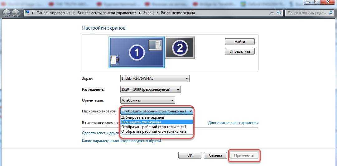 Теперь в списке выбираем строчку «Расширить эти экраны». Ещё раз сохраняем корректировки.