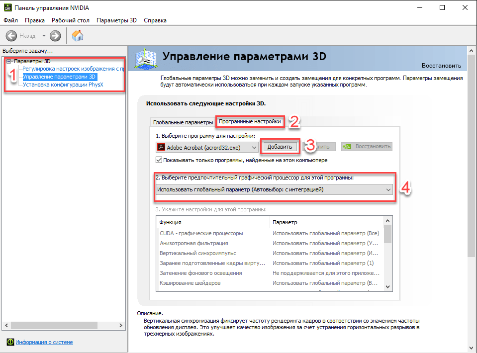 На вкладке «Программные настройки» можно настроить адаптер для каждой программы, установленной на ноутбук. На выбор три режима – интегрированная карта, дискретная карта, использование глобальных параметров.