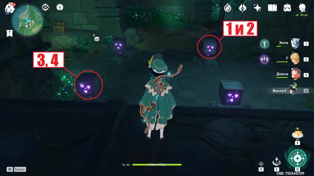 После уничтожения барьера идем в левую от входа часть пещеры. Здесь будет загадка с кубами (они стоят по квадрату). Нужно встать так, чтобы было видно свечение центрального куба.