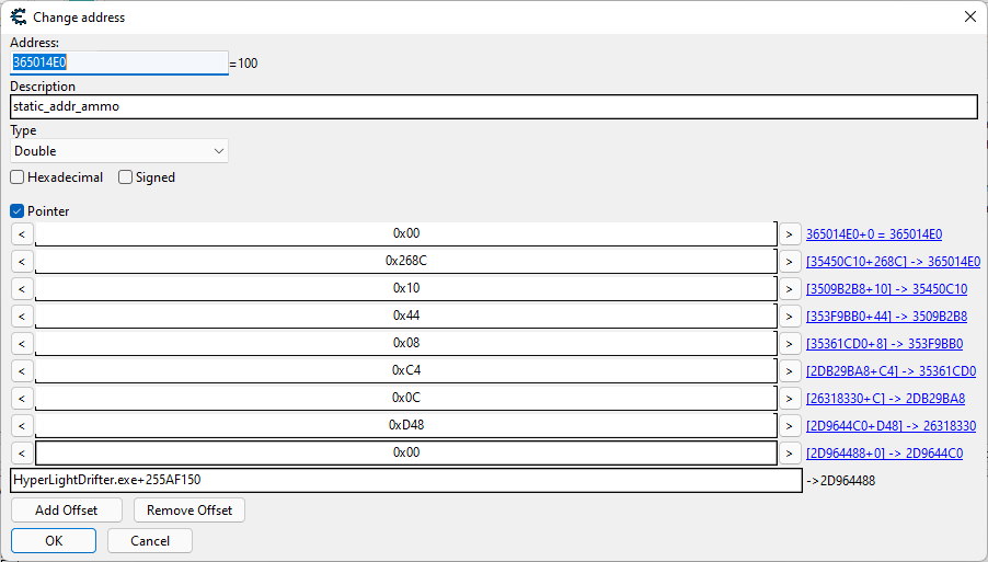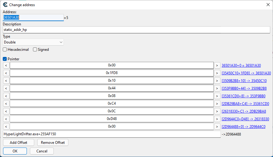Дадим название найденным нами адресам: и соответственно. Однако, как я уже рассказывал в разделе, посвященном статическим адресам, найденный нами адрес будет бесполезен после того, как мы выйдем в меню или перезапустим игру.