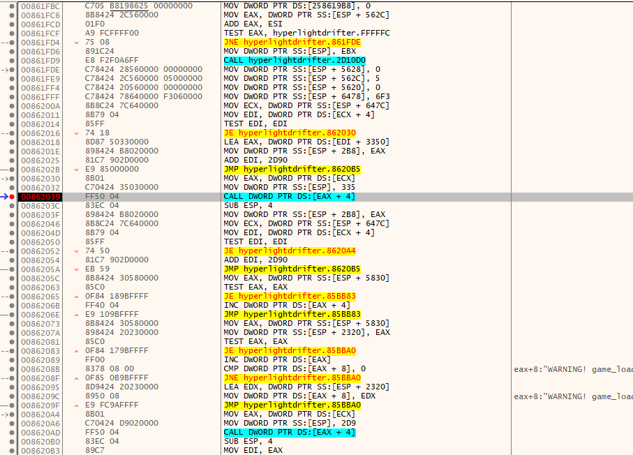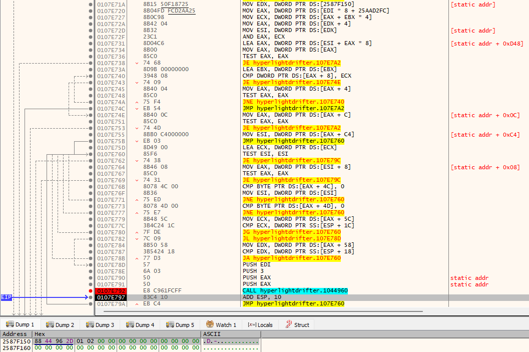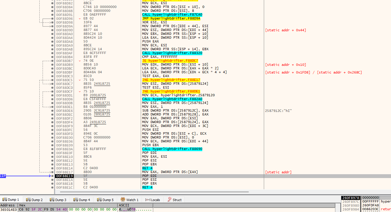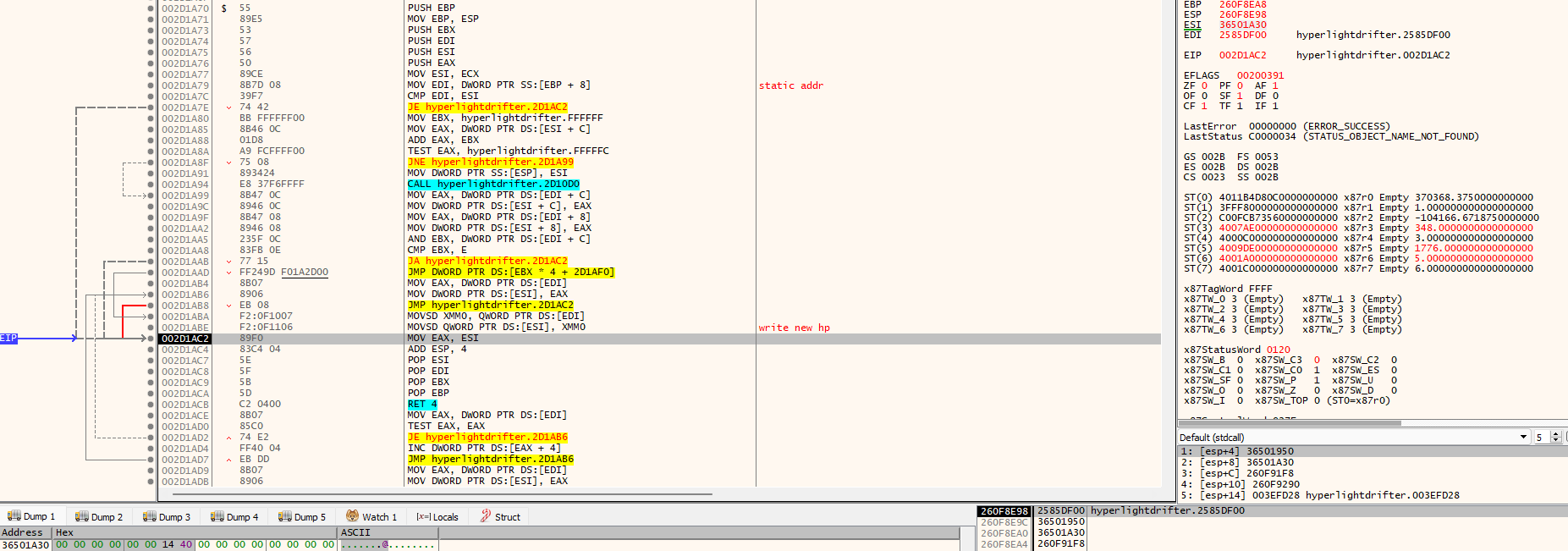 Поставим брейк‑пойнт на вызов функции по адресу , а дальше продолжим отладку, пока не остановимся на ее вызове. Зайдя внутрь функции, выполняем ее до конца. Как только мы достигнем адреса , мы увидим, что регистр хранит адрес значения hp. Очевидно, что в этой функции происходит доступ к нашему адресу через арифметику с указателями для структур, а именно через прибавление к указателю смещений и дальнейшего его разыменования. Более подробно об этом можно прочитать здесь. Нам нужно будет повторно пройтись по этой функции, чтобы узнать, через какой адрес и смещения она получает адрес значения hp.