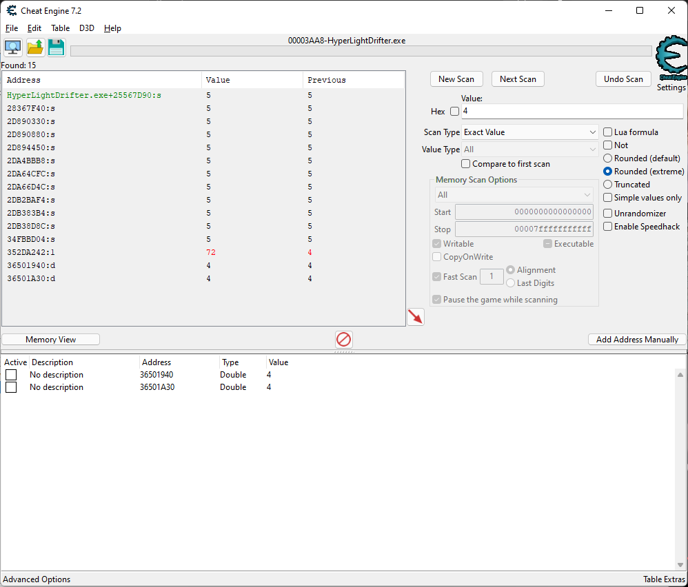 Мне приглянулись вот эти два адреса, которые я добавил в нижнее окно двойным щелчком мыши на них. Приглянулись они мне в первую очередь потому, что значения по этим адресам среди всех остальных имеют наибольший тип — double. Всегда нужно проверять от большего типа к меньшему. То есть сначала проверяем адреса, хранящие тип double, затем float, после integer и так далее. Более подробно о размере типов данных можно прочитать в документации Microsoft.