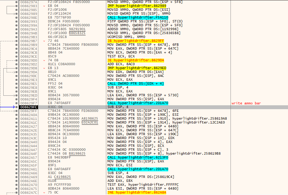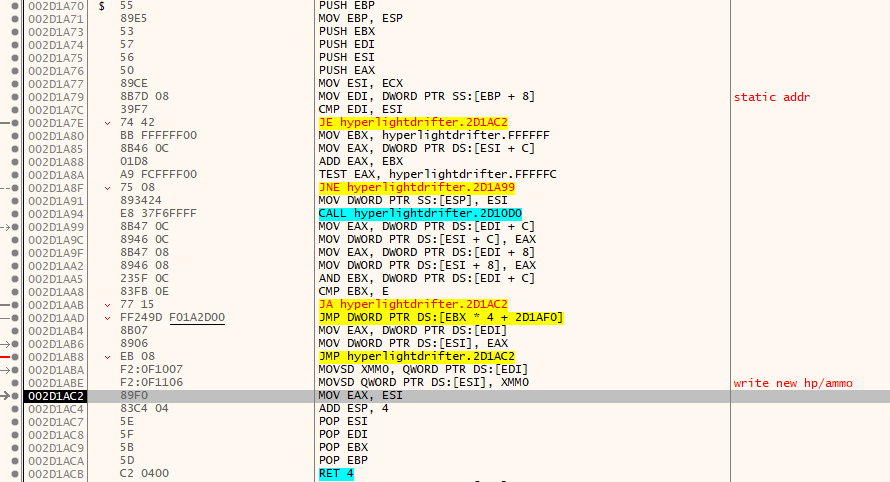 Ставим по адресу аппаратный брейк‑пойнт на запись и теряем в игре здоровье. Брейк‑пойнт срабатывает, и мы видим, что новое значение hp берется из регистра . Это значение является первым параметром текущей функции.