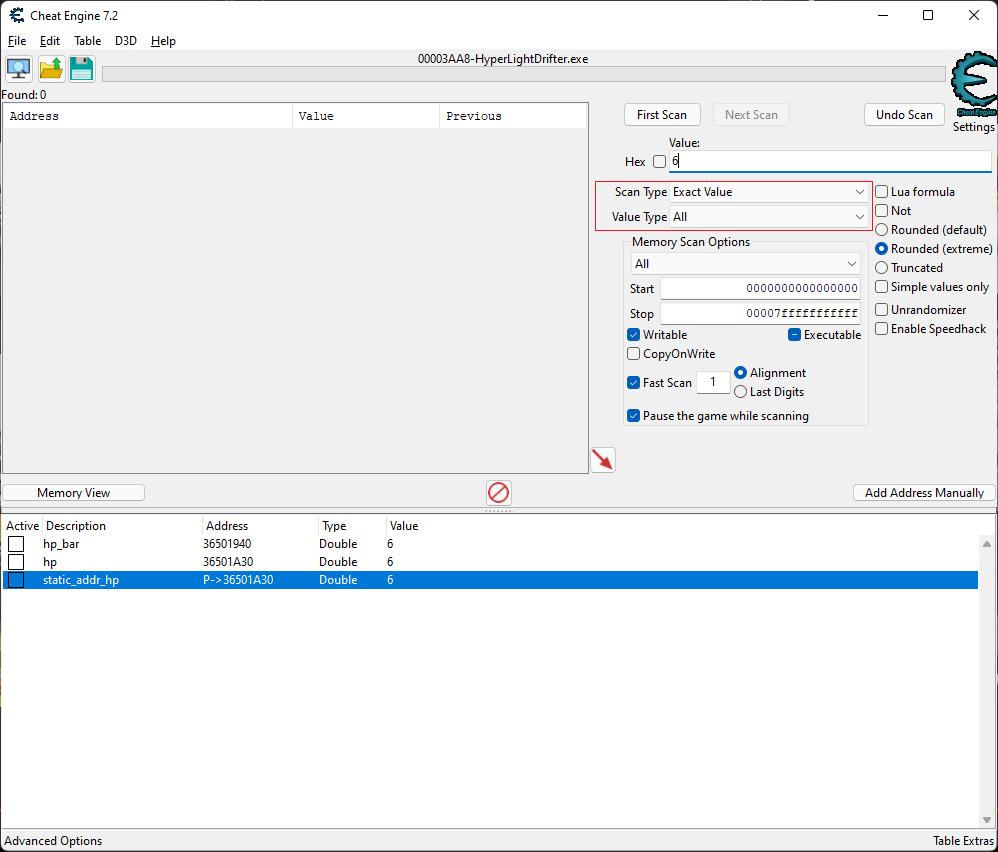 Так как мы не знаем, в каком типе хранится показатель здоровья, выставляем следующие параметры для первого сканирования.