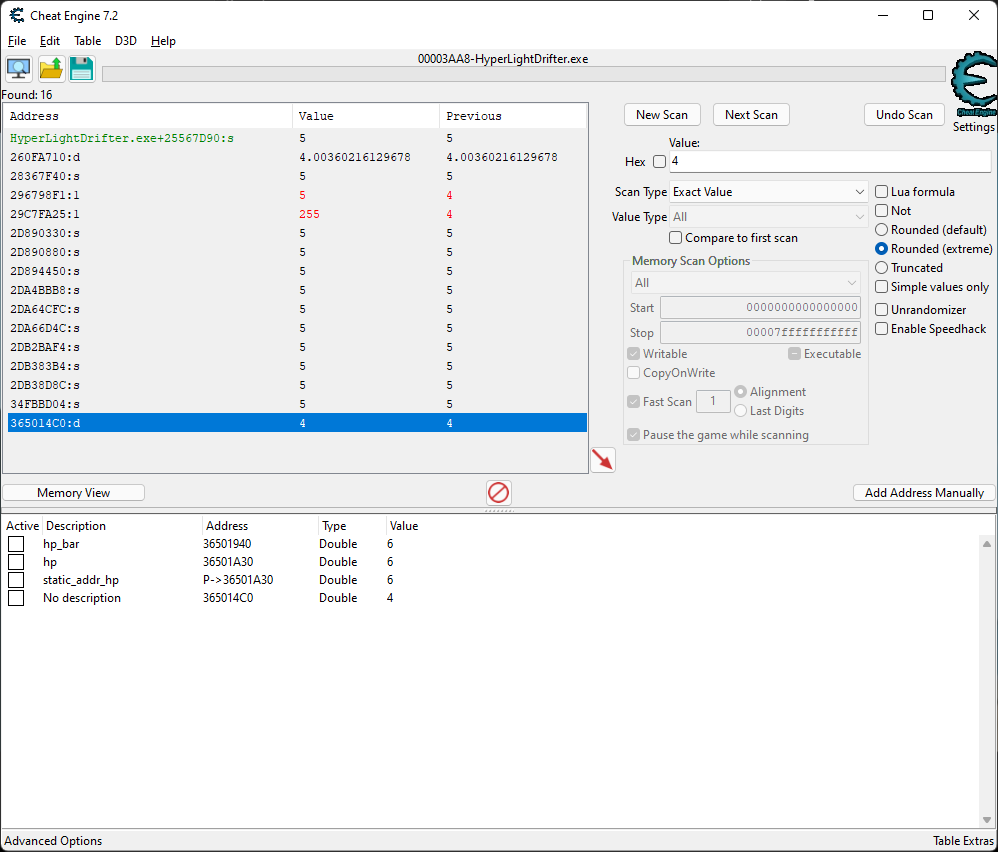 Если теперь мы поменяем значение по адресу , то на экране появится полоса hp и значение изменится. Это значит, что мы нашли адрес, в котором хранится значение здоровья в игре. Значение хранится в формате double (стандарт IEEE 754).
