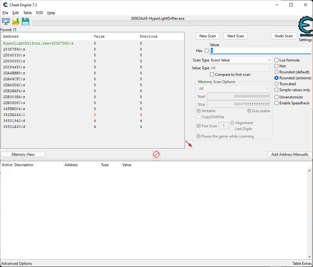 Далее продолжаем сканирование, не забывая при этом терять hp (показатель здоровья) в игре. Делаем мы это для того, чтобы отслеживать изменения значения hp в памяти игры через CE, а также уменьшать значение в поиске для следующих сканирований. Делать мы это будем до тех пор, пока не будет достигнуто адекватное количество значений в окне CE. Адекватное количество значений в данном случае — это такое количество адресов, проверка которых займет максимум минут пять.