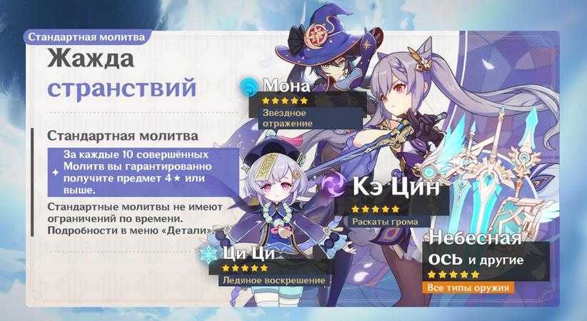 Стандартные молитвы в Genshin Impact представлены баннером Жажда странствий. Используя Судьбоносные встречи из него можно выбить: