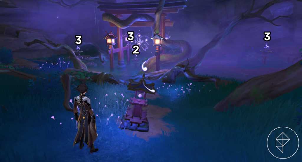 - Разрушьте барьер.Поместите Оберег в маленькое святилище перед воротами Тории. Как и в предыдущем квесте, измените символы на святынях, чтобы они представляли следующие числа, а затем активируйте первую святыню.