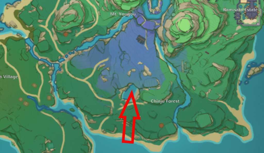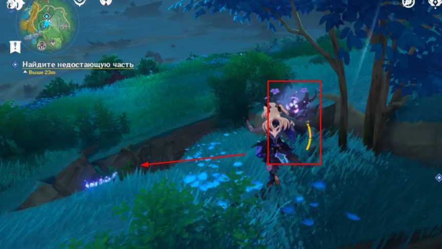 Снова пообщайтесь с Кокоми, но уже в деревне. Она будет стоять неподалеку от вас. Затем телепортируйтесь ко входу в подземелье «Поместье формации», расположенному немного левее шахты Дзякоцу. Спрыгните вниз в сторону отмеченной на мини-карте области.