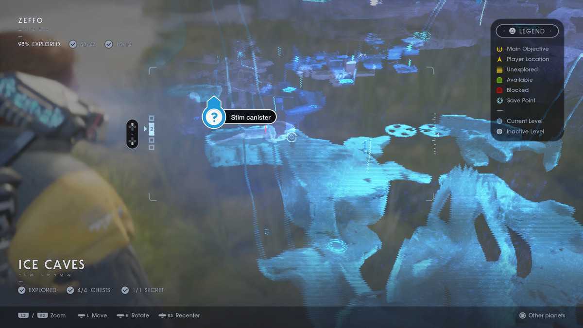 In the Ice Caves, fight the jotaz on the platform to the left of the meditation circle. Cross the platform (to the left of the spinning platforms), and look for a pair of hanging vines. Sprint to the edge of the platform, and Jedi flip toward the vine. Force pull the vine to yourself. This is going to take some careful timing (and multiple tries). Swing over to the second vine, and you’ll land next to the stim canister upgrade.