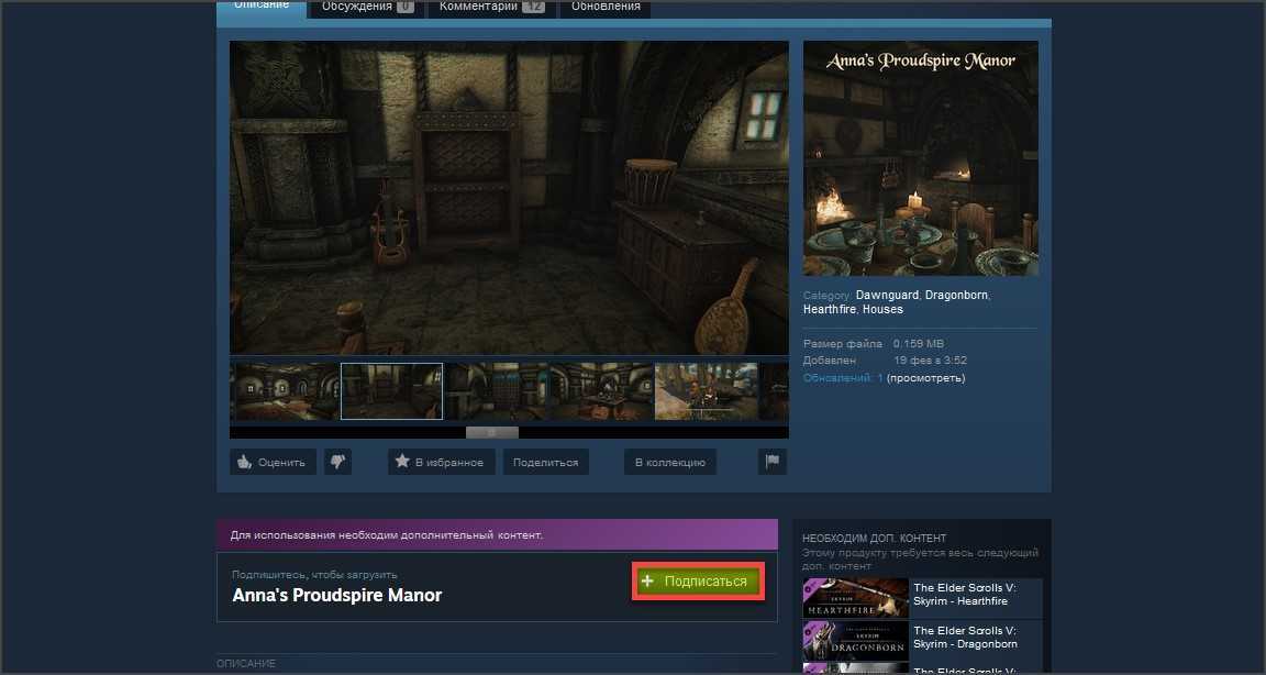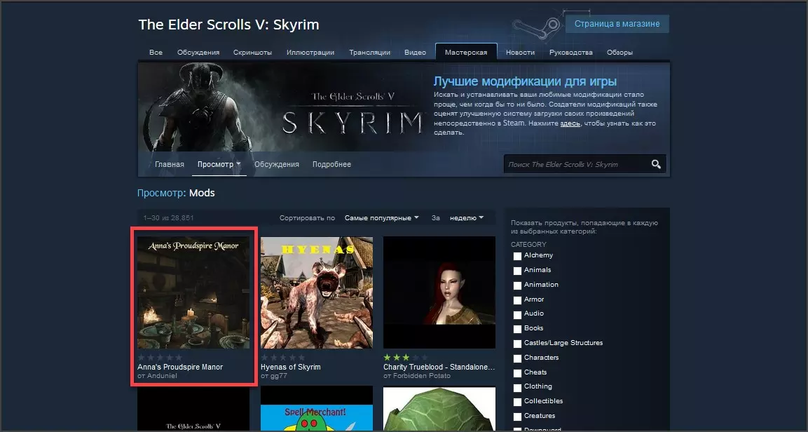 В составе платформы Steam есть такая полезная штука, как «Мастерская». Она позволяет без проблем установить модификации из списка, которые вполне соответствуют актуальной версии Скайрим. Причем делается это очень быстро.