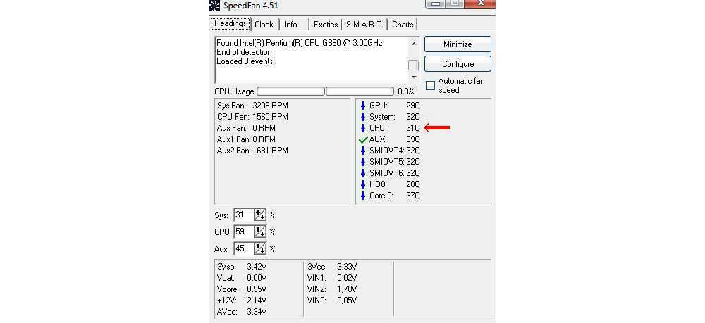 Speccy похожа на предложенные выше программы. Бесплатна, проста, но не особо функциональна. То же касается и SpeedFan. Хотя, отталкиваясь от названия, можно сделать вывод, что основной упор все-таки делается на отслеживание и контроль работы вентиляторов, от которых, во многом, и зависит нагрев процессора.
