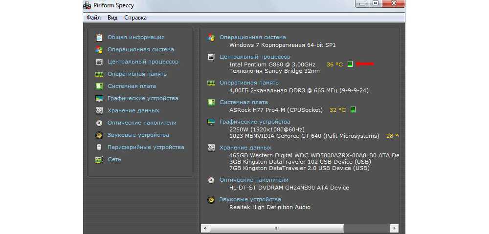 Проверить температуру CPU можно с помощью бесплатной программы Speccy, созданной разработчиками популярного чистильщика Ccleaner. Предназначается Speccy для получения подробной информации об аппаратном обеспечении. Приложение показывает основные технические характеристики процессора, жестких дисков и оптических приводов, материнской платы, видео- и аудиокарты, оперативной памяти, сетевого окружения и периферийных устройств, если таковые подключены. Также программа предоставляет детализированные сведения об операционной системе.