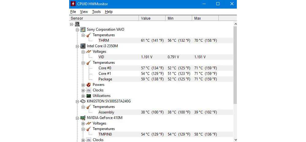 Следующее решение – CPUID HWMonitor подскажет, как проверить температуру процессора в Windows 10. Программа предоставляет информацию не только о нагреве, но и о вольтаже, а также о работе вентиляторов.