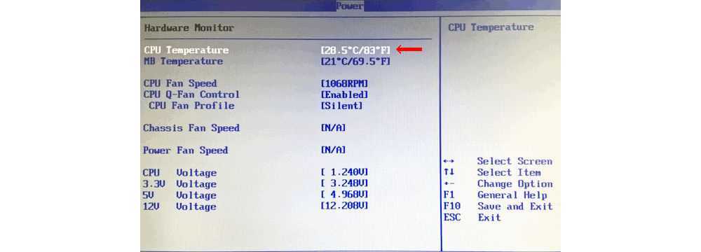 К сожалению, здесь нет простого способа проверки, поэтому вам придется проверять температуру в BIOS (базовая система ввода-вывода). BIOS расположен на материнской плате и является первым программным обеспечением, которое запускается при включении компьютера. Он отвечает за то, чтобы все оборудование в устройстве включалось и работало правильно.