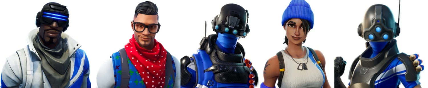 Слева направо это Blue Striker, Prodigy, Carbon Commando, Blue Team Leader и Trilogy. Было выпущено несколько скинов как часть онлайн-сервиса PlayStation Plus. Эти скины есть у большинства игроков PS4, так как PS Plus — необходимость играть онлайн. Это не так уж и редко, особенно по сравнению с некоторыми другими здесь. Однако они немного просты, поэтому за пределами консольных серверов вы их редко встретите.