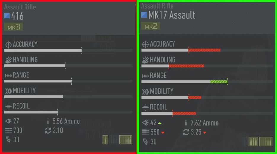 Take a look at the stats of this gun down below. You’re not seeing things, it has 42 damage. That’s the highest damage in the assault rifle class. The damage combined with its long-range capability makes this assault rifle a Full Auto DMR. It can take on those far distances the 416 cannot. You know those tough enemies that, after they detect you, take more bullets to be killed? This weapon is perfect against those soldiers. The MK17 Assault, or Scar as I like to call it, has a low rate of fire. But I don’t see it as a problem as many people do. The low bullets per minute help me shoot for longer periods, which is good for readjusting my aim. If I miss some shots, the next ones can easily be addressed to the head.