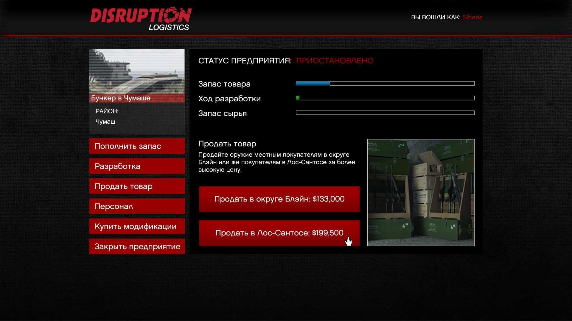 С полным улучшением бункера, полная продажа оружия начнётся от 700.000$ и до 1.050.000$, в зависимости от выбора продажи (в городе или за городом). Для продажи вам потребуется минимум ещё 1 игрок, но как и с клабхаусом, тут тоже может быть разные варианты доставки, вплоть до 4 игроков.