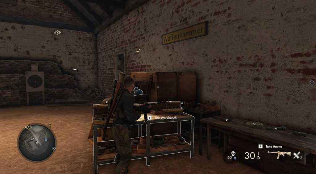 В любом случае, мы отвлеклись. Отправляйтесь на восточную сторону карты. Здесь много охранников, в том числе один в башне, который будет атаковать сверху. Верстак находится за запертой дверью, которую вы можете либо взорвать зарядом ранца, либо убить офицера и найти ключ от арсенала. Здесь есть несколько хороших улучшений оружия, не только для вашего SMG, но и с точки зрения лежащего вокруг оружия.