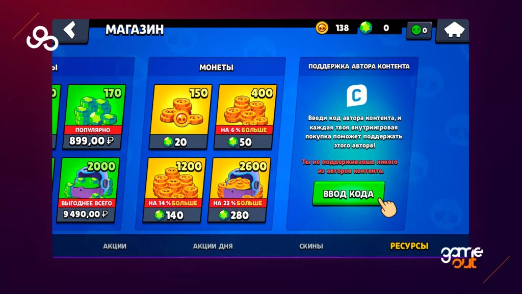Поле для ввода всех кодов находится в магазине игры. Необходимо долистать до самого конца. Там вы увидите плашку с названием “Поддержка автора контента” и большую кнопку “Ввод кода”.