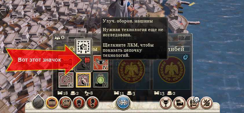 Наведя курсор на этот значок, мне всплывает подсказка, что для того чтобы продолжиться строительство мне нужна технология под названием «Улучшенные оборонительные машины».Щелкнув прямо в строительном меню по значку наконечник копья и колесо, я сразу попадаю в меню технологий, и вижу в древе ту иконку которую мне необходимо изучить. Кликнув на ней, она добавляется в очередь изучения.