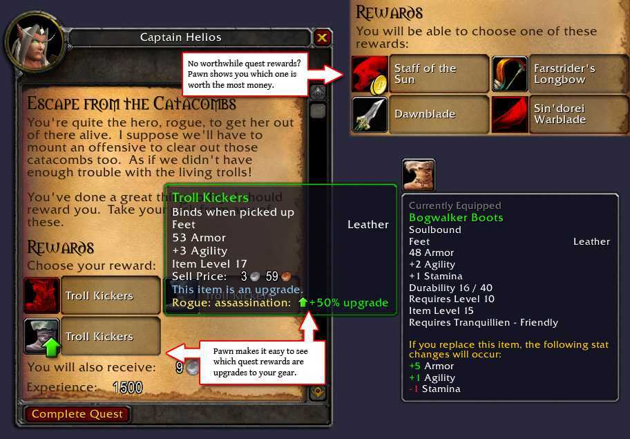 Pawn поможет вам выбрать лучшее снаряжение и подсказать, какой предмет экипировки больше всего подходит для вашей специализации. Аддон поможет вам решить, лучше ли использовать плащ с искусностью 100 или же с критом 80 и тому подобное.