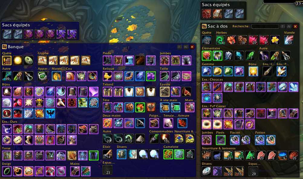 Очень удобная модификация, которая предназначена для упрощенного контроля за содержимым ваших сумок. Теперь вам не нужно открывать пять разных окон, чтобы найти нужный предмет. Данный аддон объединяет все сумки в одну большую и позволяет сортировать вещи при помощи нужных фильтров. Есть еще одна удобная функция — просмотр банка в режиме оффлайн, находясь в любой точке игрового мира.