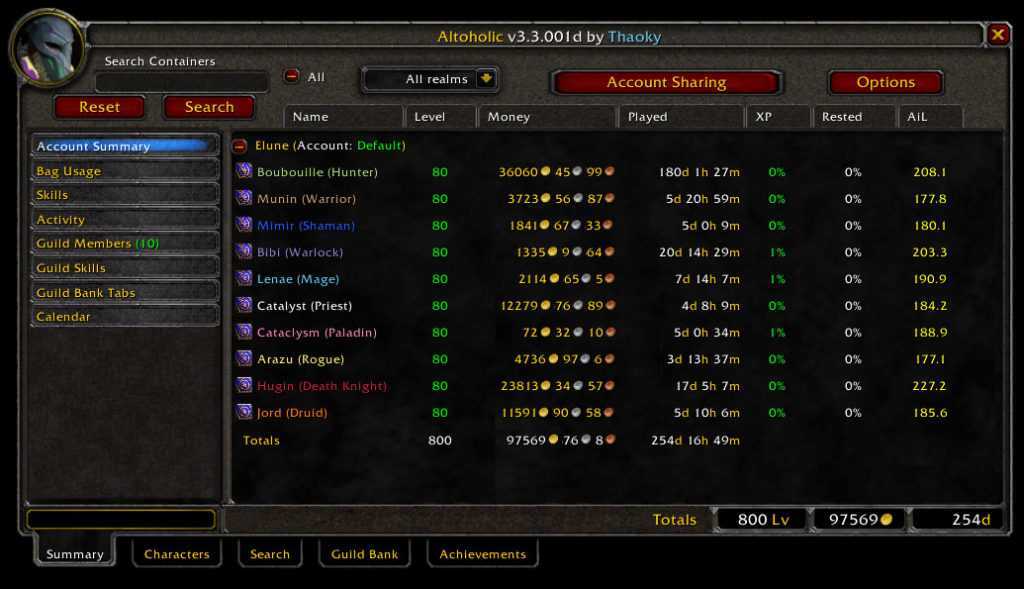 Позволяет удобно просматривать информацию о всех персонажах учетной записи, а именно: кол-во золота на каждом из них, токены, различные валюты, прокачанные профессии и т.п.