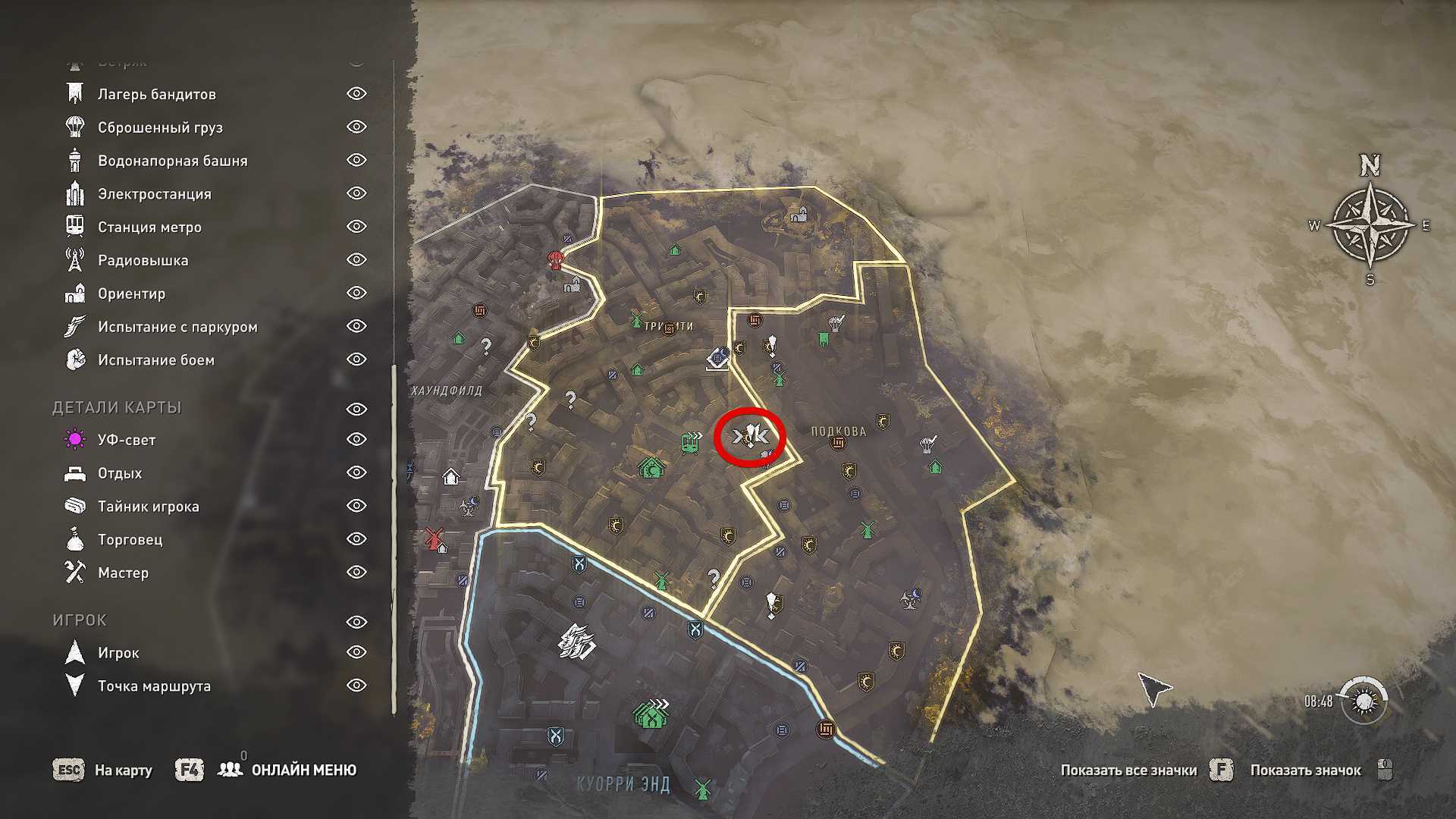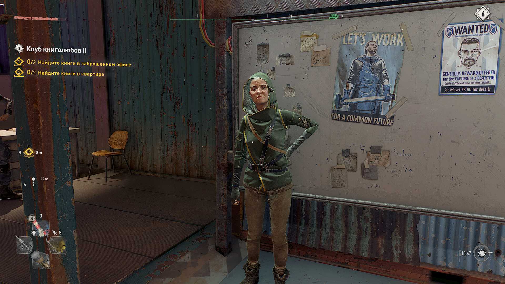 Осматриваем карту на стене позади Рахима и отправляемся к нужным маркерам. В темной зоне находим листовку на тумбочке, а в убежище бандитов — на круглом обеденном столе.